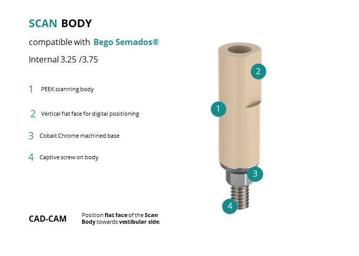 - CAD-CAM: Position flat face of the Scan Body towards vestibular side.
