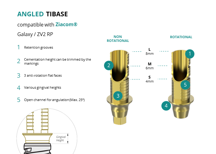 GT-Medical's Angled Ti-Base are compatible with Galaxy / ZV2 RP implants from Ziacom®, ensuring a stable and long-lasting connection between the implant and the prosthesis, while also allowing angulations to be corrected up to 25 degrees. They are made entirely of Titanium Grade 5 with a yellow anodizing for a more aesthetic finish. They have a cementation trunk that can be cut to various heights with an open channel to allow angulation, 3 flat faces to perform the anti-rotating function and a gingival body of various heights, depending on the type of connection.