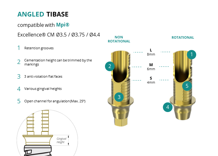 GT-Medical's Angled Ti-Base are compatible with Excellence® CM Ø3.5 / Ø3.75 / Ø4.4 implants from Mpi®, ensuring a stable and long-lasting connection between the implant and the prosthesis, while also allowing angulations to be corrected up to 25 degrees. They are made entirely of Titanium Grade 5 with a yellow anodizing for a more aesthetic finish. They have a cementation trunk that can be cut to various heights with an open channel to allow angulation, 3 flat faces to perform the anti-rotating function and a gingival body of various heights, depending on the type of connection.