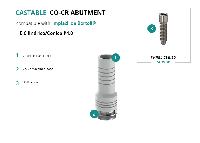 GT-Medical's castable Co-Cr abutment is compatible with HE Cilindrico/Conico P4.0 implants from Implacil de Bortoli®, ensuring a solid base for the prosthetic structure and guaranteeing an optimal fit with the implant. It is made up of a machined Cobalt Chrome base and a castable plastic cap.