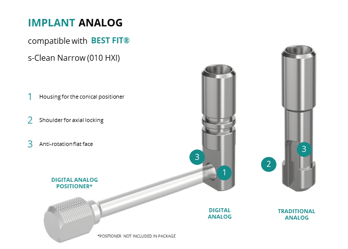 The GT-Medical analog compatible with the Best Fit® s-Clean Narrow (010 HXI) implant line is made of Stainless Steel, has a diameter of 3.0mm, and accurately replicates the connection of this Best Fit® implant.