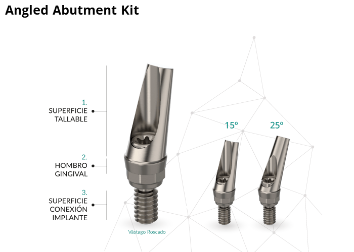 The Angled Abutment Kit consists of the Angled Abutment and screw, both made of Titanium Grade 5 with a mirror-polished finish to prevent bacterial plaque adhesion.