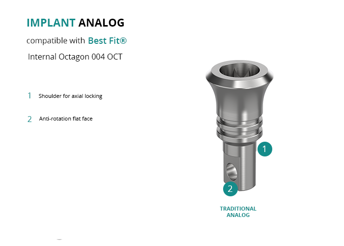 The GT-Medical analog compatible with the Best Fit® Internal Octagon 004 OCT implant line is made of Stainless Steel, has a diameter of 5.9mm, and accurately replicates the connection of this Best Fit® implant.