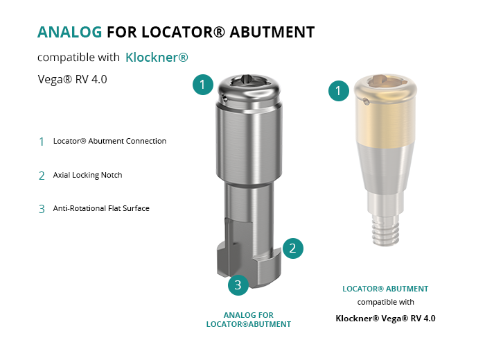 The analog for Locator® Abutment is essential for creating the model of a removable overdenture restoration that uses Locator® abutments on implants, such as those from Klockner® with the Vega® RV 4.0 platform.