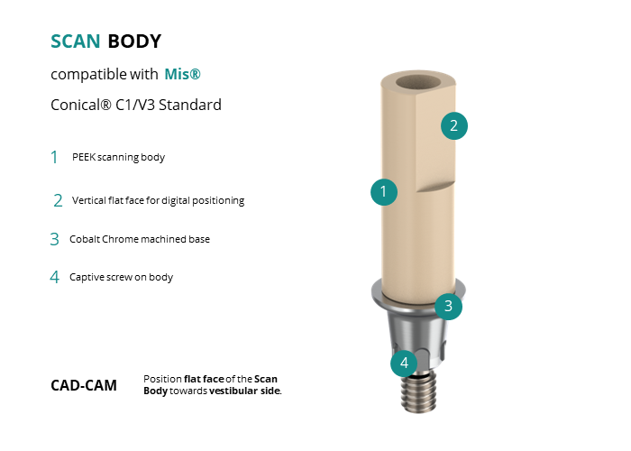 - CAD-CAM: Position flat face of the Scan Body towards vestibular side.