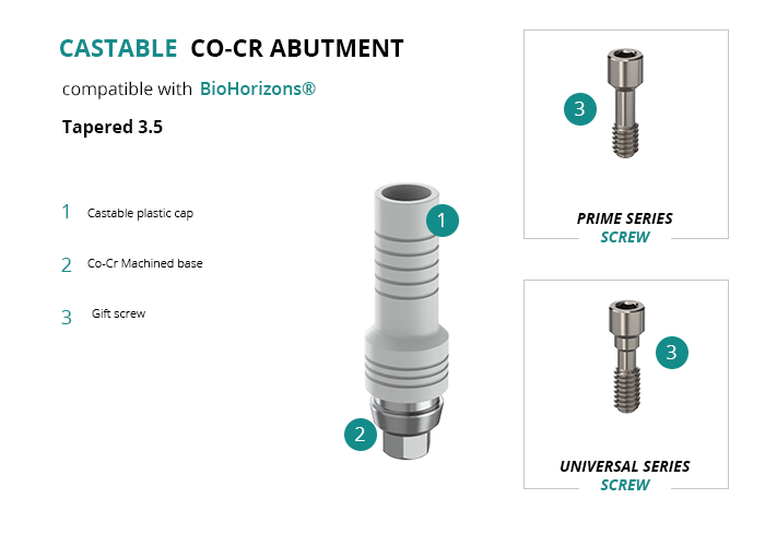 GT-Medical's castable Co-Cr abutment is compatible with Tapered 3.5 implants from BioHorizons®, ensuring a solid base for the prosthetic structure and guaranteeing an optimal fit with the implant. It is made up of a machined Cobalt Chrome base and a castable plastic cap.