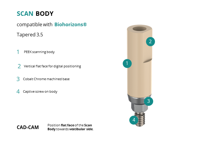 - CAD-CAM: Position flat face of the Scan Body towards vestibular side.