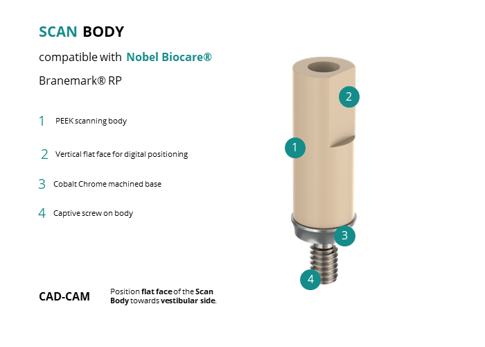 - CAD-CAM: Position flat face of the Scan Body towards vestibular side.