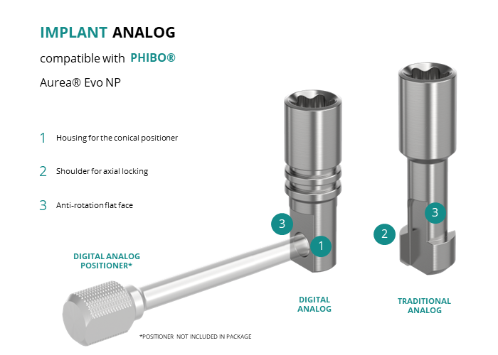 The GT-Medical analog compatible with the Phibo® Aurea® Evo NP implant line is made of Stainless Steel, has a diameter of 3.5mm, and accurately replicates the connection of this Phibo® implant.