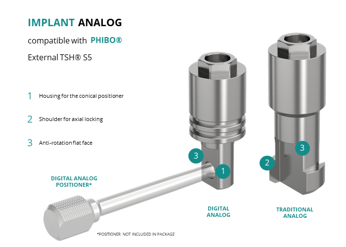 The GT-Medical analog compatible with the Phibo® External TSH® S5 implant line is made of Stainless Steel, has a diameter of 5.0mm, and accurately replicates the connection of this Phibo® implant.