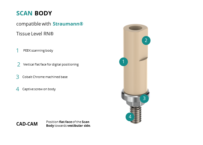 - CAD-CAM: Position flat face of the Scan Body towards vestibular side.