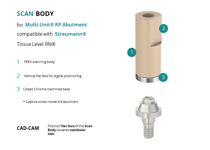 - CAD-CAM: Position flat face of the Scan Body towards vestibular side.
