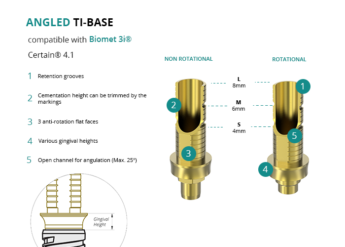 GT-Medical's Angled Ti-Base are compatible with Certain® 4.1 implants from Biomet 3i®, ensuring a stable and long-lasting connection between the implant and the prosthesis, while also allowing angulations to be corrected up to 25 degrees. They are made entirely of Titanium Grade 5 with a yellow anodizing for a more aesthetic finish. They have a cementation trunk that can be cut to various heights with an open channel to allow angulation, 3 flat faces to perform the anti-rotating function and a gingival body of various heights, depending on the type of connection.