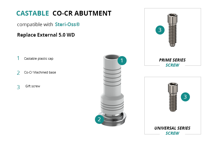 GT-Medical's castable Co-Cr abutment is compatible with Replace External 5.0 WD implants from Steri-Oss®, ensuring a solid base for the prosthetic structure and guaranteeing an optimal fit with the implant. It is made up of a machined Cobalt Chrome base and a castable plastic cap.