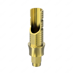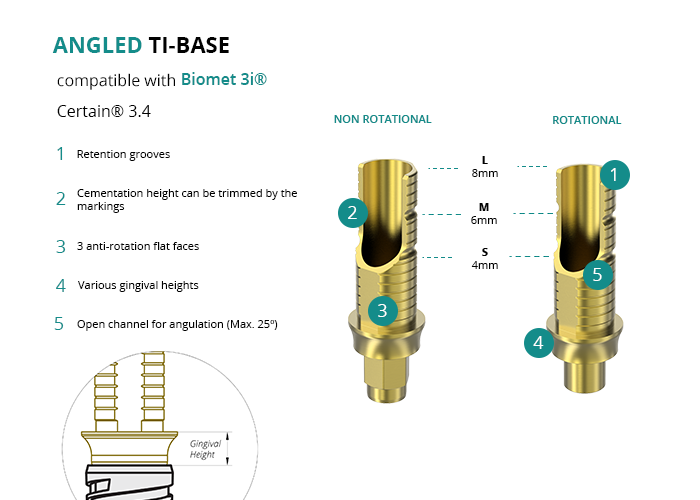 GT-Medical's Angled Ti-Base are compatible with Certain® 3.4 implants from Biomet 3i®, ensuring a stable and long-lasting connection between the implant and the prosthesis, while also allowing angulations to be corrected up to 25 degrees. They are made entirely of Titanium Grade 5 with a yellow anodizing for a more aesthetic finish. They have a cementation trunk that can be cut to various heights with an open channel to allow angulation, 3 flat faces to perform the anti-rotating function and a gingival body of various heights, depending on the type of connection.