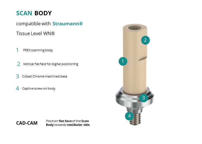 - CAD-CAM: Position flat face of the Scan Body towards vestibular side.