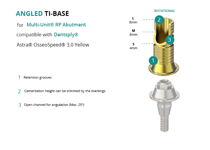 Angled Titanium Base for Multi-Unit® RP Abutment compatible with Dentsply® Astra® OsseoSpeed® 3.0 Yellow