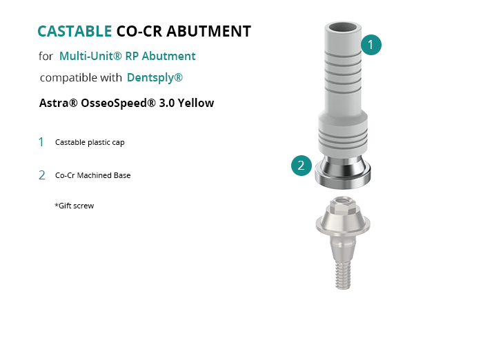 GT-Medical's castable Co-Cr abutment is compatible with Astra® OsseoSpeed® 3.0 Yellow implants from Dentsply®, ensuring a solid base for the prosthetic structure and guaranteeing an optimal fit with the Multi-Unit® RP Abutment. It is made up of a machined Cobalt Chrome base and a castable plastic cap.