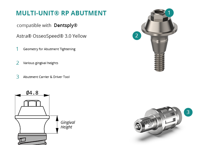 The Multi-Unit® RP Abutment from GT-Medical is compatible with Astra® OsseoSpeed® 3.0 Yellow from Dentsply®, providing a durable and stable connection for multiple restorations. Manufactured from Grade 5 Titanium has a diameter of 4.8mm, it guarantees high strength, biocompatibility, and durability in implant-supported restorations. Its design includes various gingival heights, facilitating adaptation to different soft tissue profiles and ensuring optimal aesthetics.