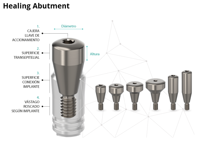The transepithelial surface has a height that varies between 1mm and 5mm depending on the implant model. The emergence diameter is variable depending on the tooth to be rehabilitated.