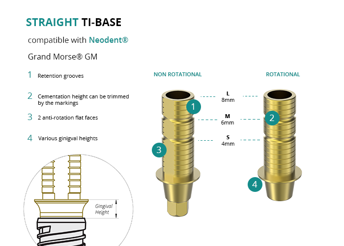 GT-Medical's Ti-Base are compatible with Grand Morse® GM implants from Neodent®, allowing a stable and long-lasting connection between the implant and the prosthesis. They are made entirely of Titanium Grade 5 with a yellow anodized for a more aesthetic finish. They have a cementation trunk that can be cut to various heights, 2 flat faces to perform the anti-rotating function and a gingival body of various heights, depending on the type of connection.