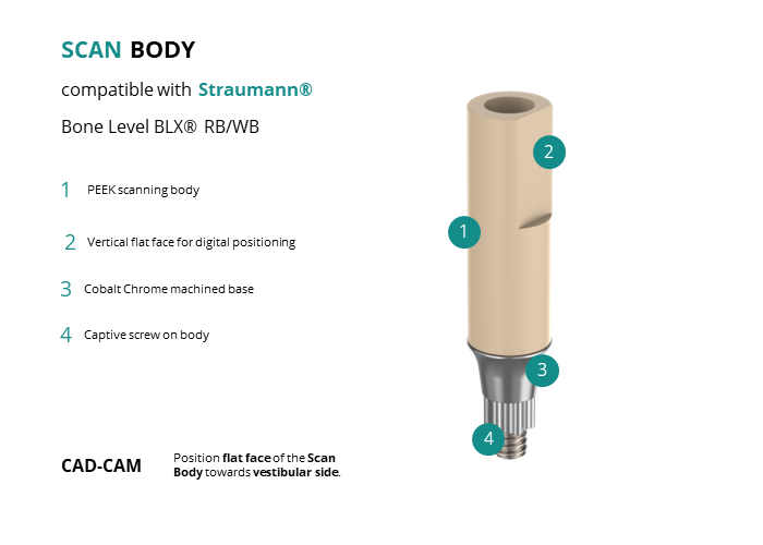 - CAD-CAM: Position flat face of the Scan Body towards vestibular side.
