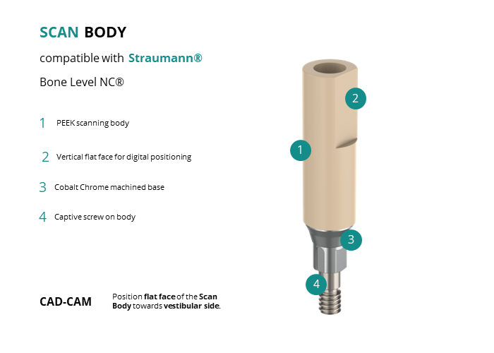 - CAD-CAM: Position flat face of the Scan Body towards vestibular side.
