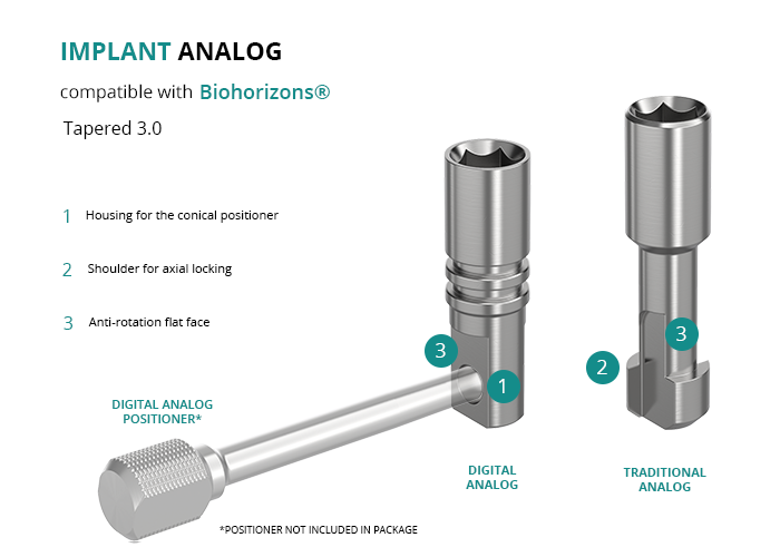 - Digital Analog: for models made of resin through 3D printing, locking is achieved using a slightly conical positioner, ensuring axial positioning.