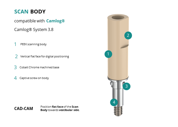 - CAD-CAM: Position flat face of the Scan Body towards vestibular side.