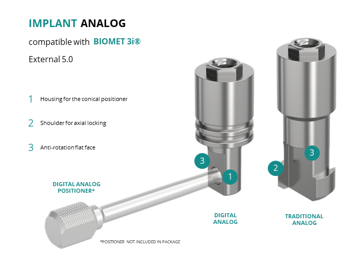 - Digital Analog: for models made of resin through 3D printing, locking is achieved using a slightly conical positioner, ensuring axial positioning.