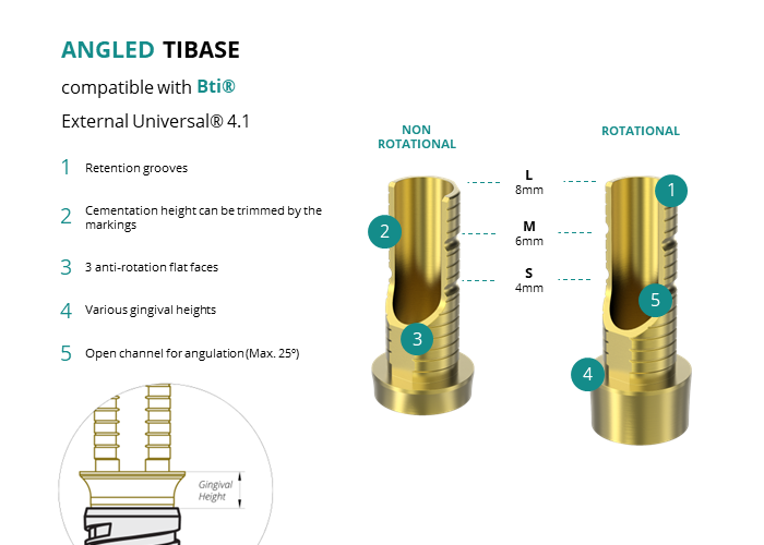 GT-Medical's Angled Ti-Base are compatible with External Universal® 4.1 implants from Bti®, ensuring a stable and long-lasting connection between the implant and the prosthesis, while also allowing angulations to be corrected up to 25 degrees. They are made entirely of Titanium Grade 5 with a yellow anodizing for a more aesthetic finish. They have a cementation trunk that can be cut to various heights with an open channel to allow angulation, 3 flat faces to perform the anti-rotating function and a gingival body of various heights, depending on the type of connection.