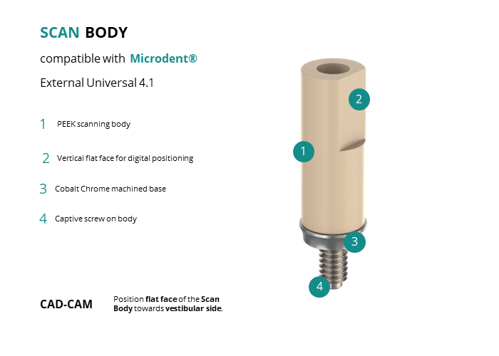 - CAD-CAM: Position flat face of the Scan Body towards vestibular side.