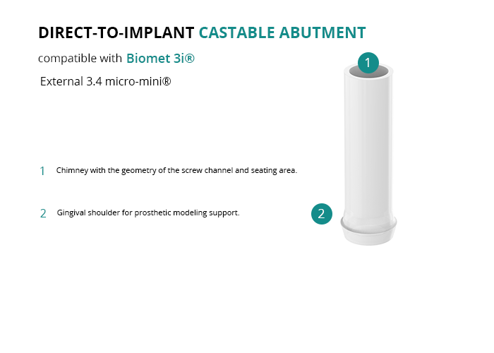 The direct-to-implant castable is ideal for creating customized abutments and screw-retained frameworks, ensuring a reliable and high-quality fit for restorations on implants with the External 3.4 micro-mini® platform from Biomet 3i®.