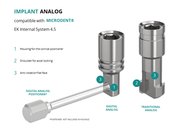 The GT-Medical analog compatible with the Microdent® EK Internal System 4.5 implant line is made of Stainless Steel, has a diameter of 4.5mm, and accurately replicates the connection of this Microdent® implant.