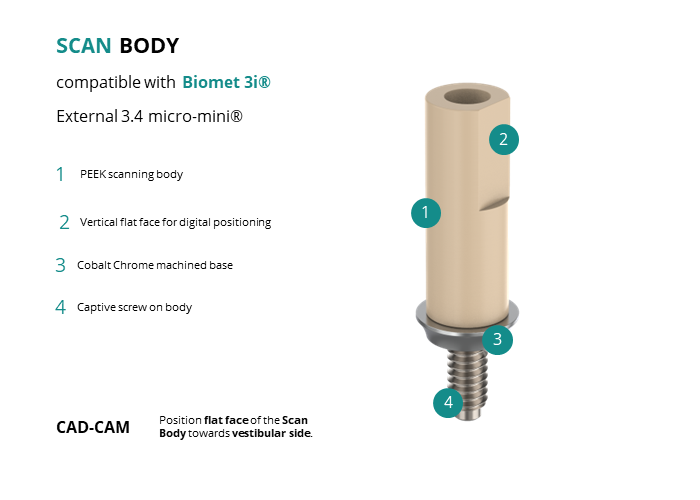 - CAD-CAM: Position flat face of the Scan Body towards vestibular side.