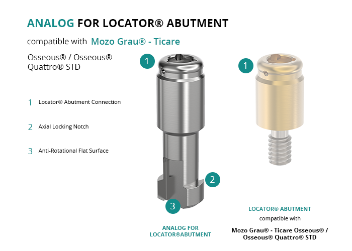 The analog for Locator® Abutment is essential for creating the model of a removable overdenture restoration that uses Locator® abutments on implants, such as those from Mozo Grau® - Ticare with the Osseous® / Osseous® Quattro® STD platform.