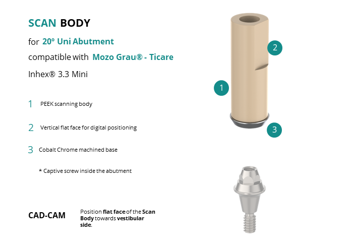 Scan Body for 20� Uni Abutment compatible with Mozo Grau® - Ticare Inhex® 3.3 Mini