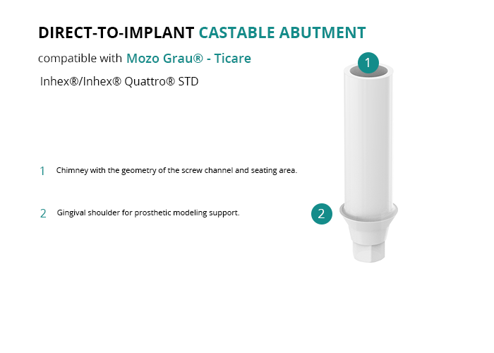 The direct-to-implant castable is ideal for creating customized abutments and screw-retained frameworks, ensuring a reliable and high-quality fit for restorations on implants with the Inhex®/Inhex® Quattro® STD platform from Mozo Grau® - Ticare.