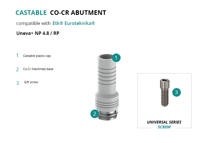 Castable Abutment with Co-Cr Base compatible with Etk® Euroteknika® Uneva+ NP 4.8 / RP