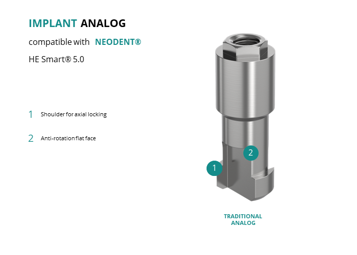 The GT-Medical analog compatible with the Neodent® HE Smart® 5.0 implant line is made of Stainless Steel, has a diameter of 5.0mm, and accurately replicates the connection of this Neodent® implant.