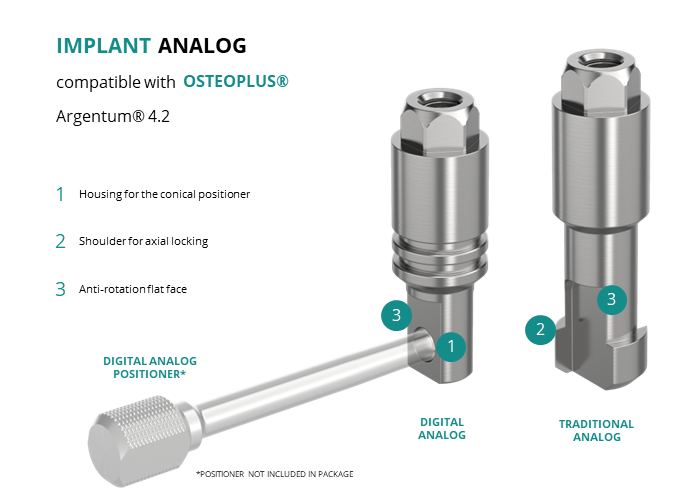 The GT-Medical analog compatible with the Osteoplus® Argentum® 4.2 implant line is made of Stainless Steel, has a diameter of 4.2mm, and accurately replicates the connection of this Osteoplus® implant.