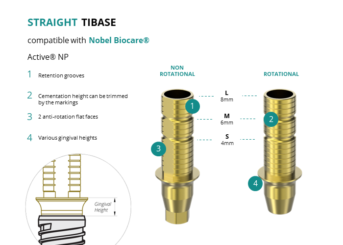 GT-Medical's Ti-Base are compatible with Active® NP implants from Nobel Biocare®, allowing a stable and long-lasting connection between the implant and the prosthesis. They are made entirely of Titanium Grade 5 with a yellow anodized for a more aesthetic finish. They have a cementation trunk that can be cut to various heights, 2 flat faces to perform the anti-rotating function and a gingival body of various heights, depending on the type of connection.
