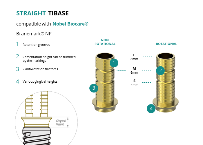 GT-Medical's Ti-Base are compatible with Branemark® NP implants from Nobel Biocare®, allowing a stable and long-lasting connection between the implant and the prosthesis. They are made entirely of Titanium Grade 5 with a yellow anodized for a more aesthetic finish. They have a cementation trunk that can be cut to various heights, 2 flat faces to perform the anti-rotating function and a gingival body of various heights, depending on the type of connection.