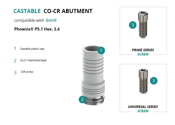 Castable Abutment with Co-Cr Base compatible with Gmi® Phoenix® P5.1 Hex. 3.4
