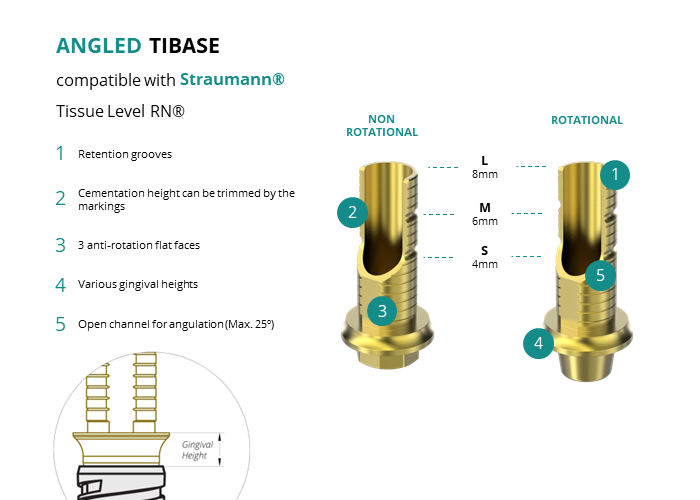 GT-Medical's Angled Ti-Base are compatible with Tissue Level RN® implants from Straumann®, ensuring a stable and long-lasting connection between the implant and the prosthesis, while also allowing angulations to be corrected up to 25 degrees. They are made entirely of Titanium Grade 5 with a yellow anodizing for a more aesthetic finish. They have a cementation trunk that can be cut to various heights with an open channel to allow angulation, 3 flat faces to perform the anti-rotating function and a gingival body of various heights, depending on the type of connection.