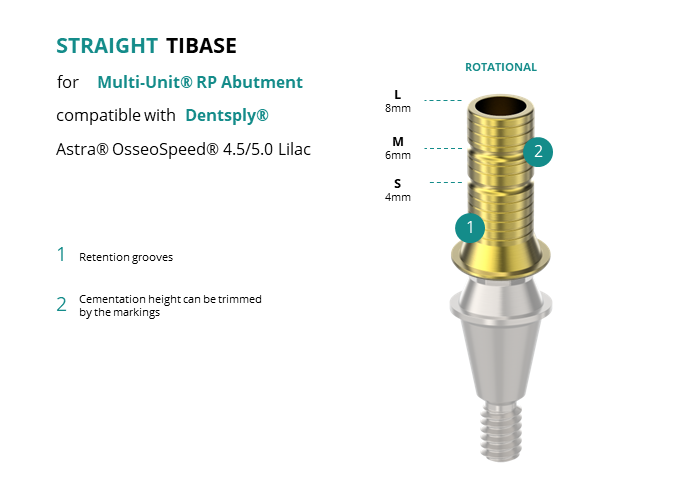 GT-Medical's Ti-Base are compatible with Astra® OsseoSpeed® 4.5/5.0 Lilac implants from Dentsply®, allowing a stable and long-lasting connection between the Multi-Unit® RP Abutment and the prosthesis. They are made entirely of Titanium Grade 5 with a yellow anodized for a more aesthetic finish. They have a grooved cementation trunk that can be cut to various heights.
