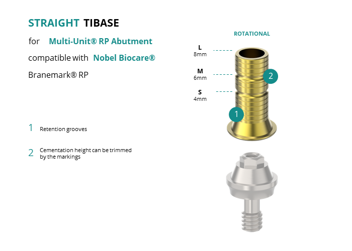 GT-Medical's Ti-Base are compatible with Branemark® RP implants from Nobel Biocare®, allowing a stable and long-lasting connection between the Multi-Unit® RP Abutment and the prosthesis. They are made entirely of Titanium Grade 5 with a yellow anodized for a more aesthetic finish. They have a grooved cementation trunk that can be cut to various heights.
