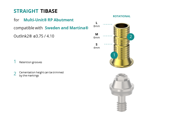 GT-Medical's Ti-Base are compatible with Outlink2® Ø3.75 / 4.10 implants from Sweden and Martina®, allowing a stable and long-lasting connection between the Multi-Unit® RP Abutment and the prosthesis. They are made entirely of Titanium Grade 5 with a yellow anodized for a more aesthetic finish. They have a grooved cementation trunk that can be cut to various heights.