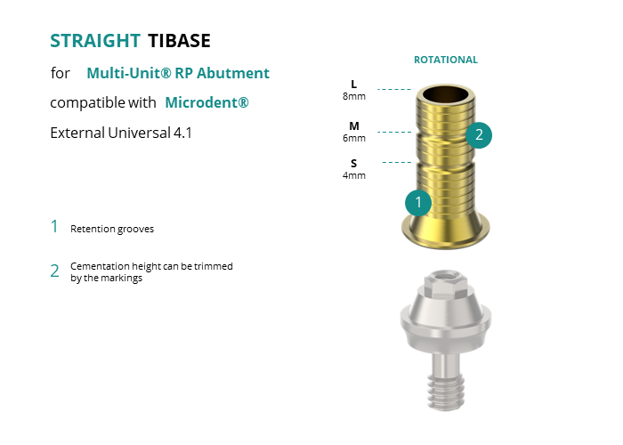 GT-Medical's Ti-Base are compatible with External Universal 4.1 implants from Microdent®, allowing a stable and long-lasting connection between the Multi-Unit® RP Abutment and the prosthesis. They are made entirely of Titanium Grade 5 with a yellow anodized for a more aesthetic finish. They have a grooved cementation trunk that can be cut to various heights.
