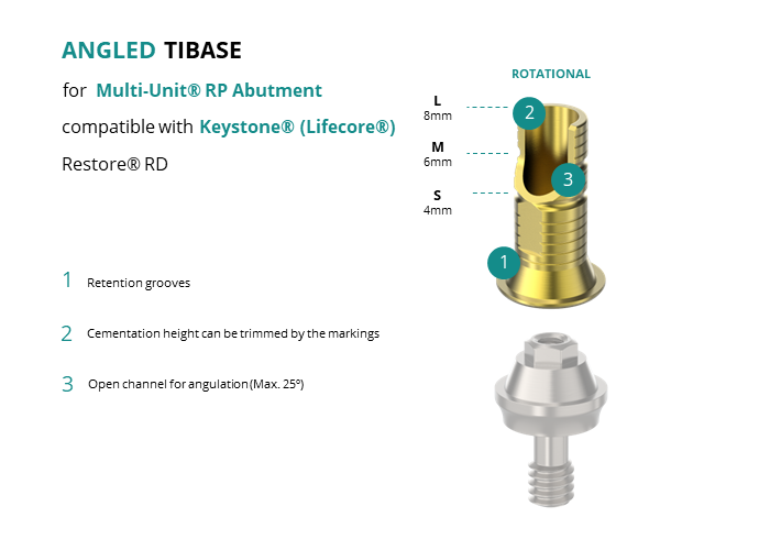 GT-Medical's Angled Ti-Base are compatible with Restore® RD implants from Keystone® (Lifecore®), ensuring a stable and long-lasting connection between the Multi-Unit® RP Abutment and the prosthesis, while also allowing angulations to be corrected up to 25 degrees. They are made entirely of Titanium Grade 5 with a yellow anodizing for a more aesthetic finish. They have a grooved cementation trunk that can be cut to various heights.